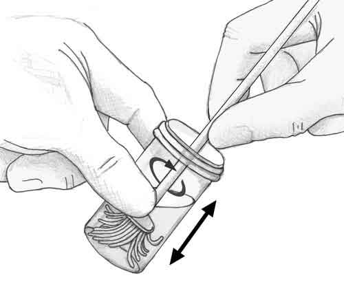 • Agitate end of cervix sampler broom, endocervical brush or spatula in the liquid-based cytology solution — Figure 6.15