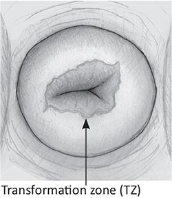 • Need to sample cells from the cervical Transformation Zone (TZ) — where red endocervical cells change to paler ectocervical cells