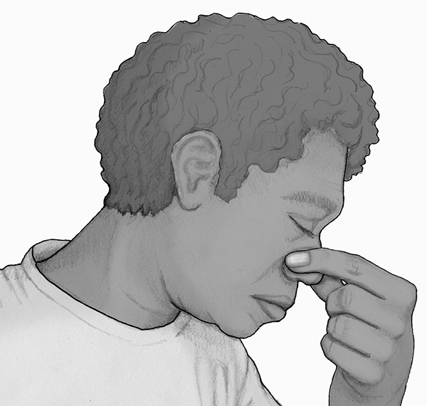 • Pinch fleshy lower part of nose (just below upper bony part) closing the nostrils together — must be uncomfortably tight to work properly. Person can often do this themself — Figure 2.24