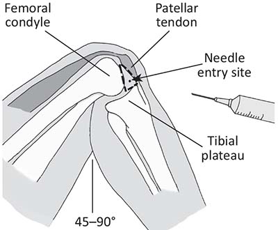 Note: Leave a bit of air in preloaded syringe. Air can easily be injected into joint but not tissue (strong resistance), helps you know if you are in joint